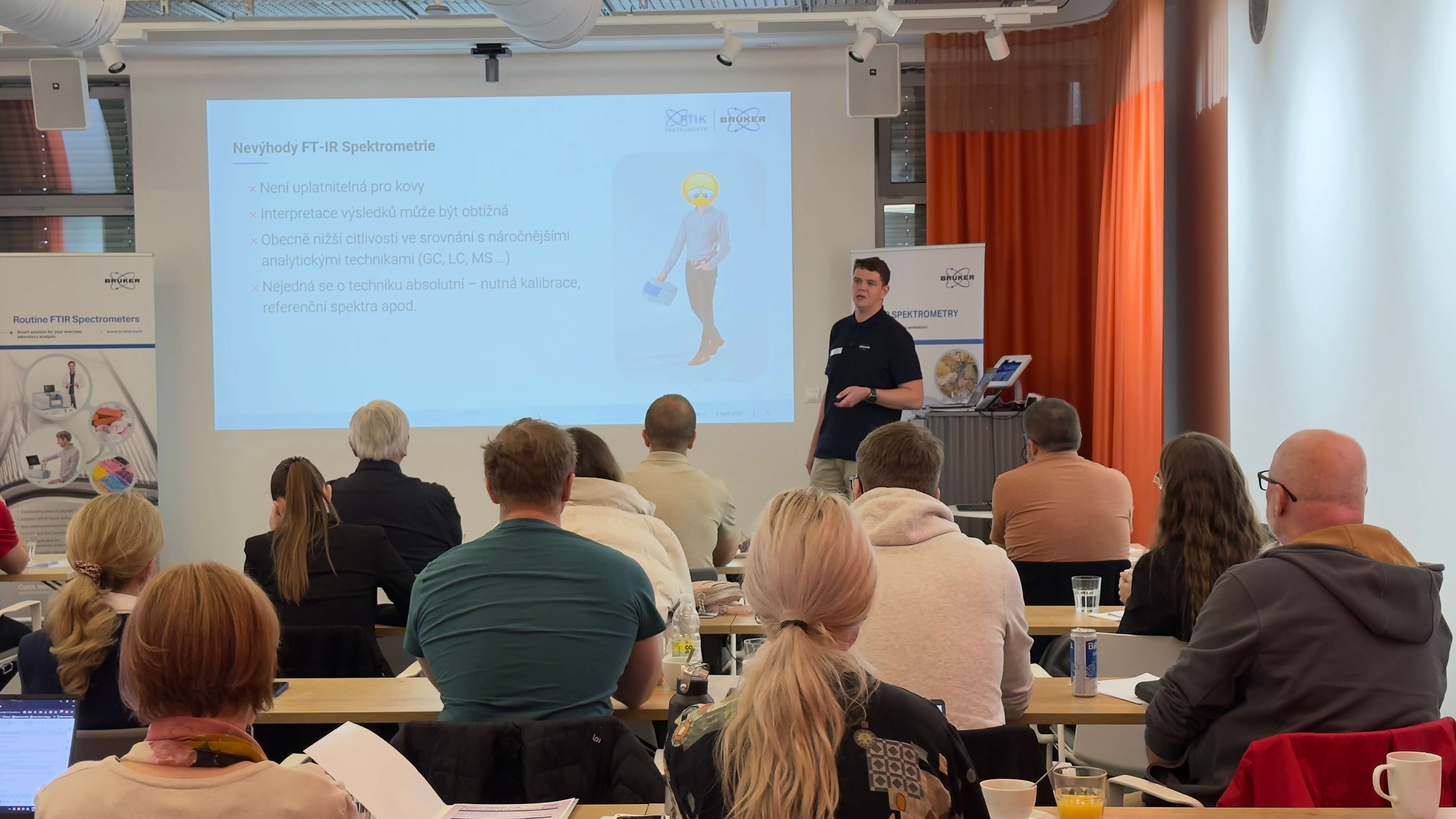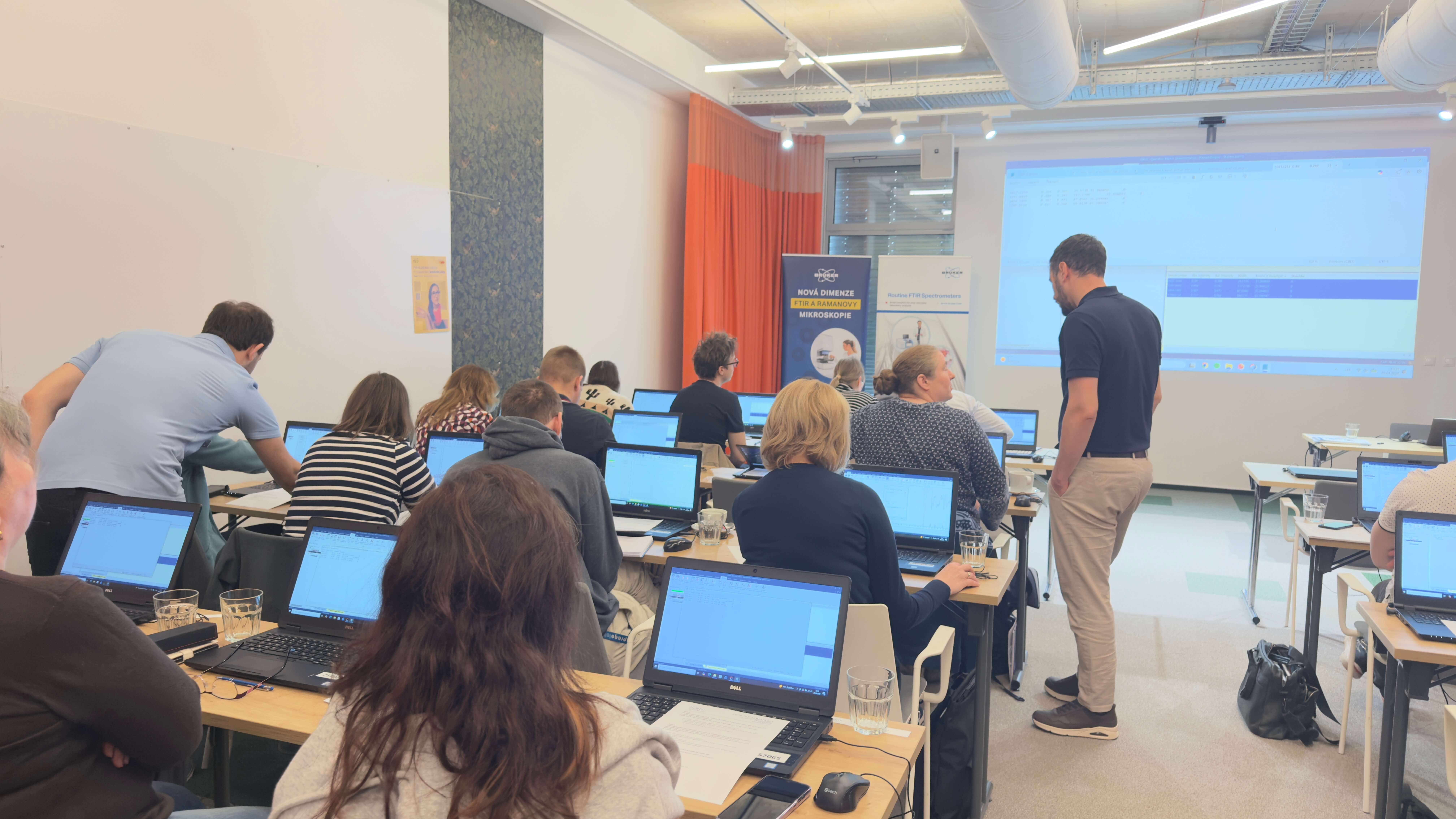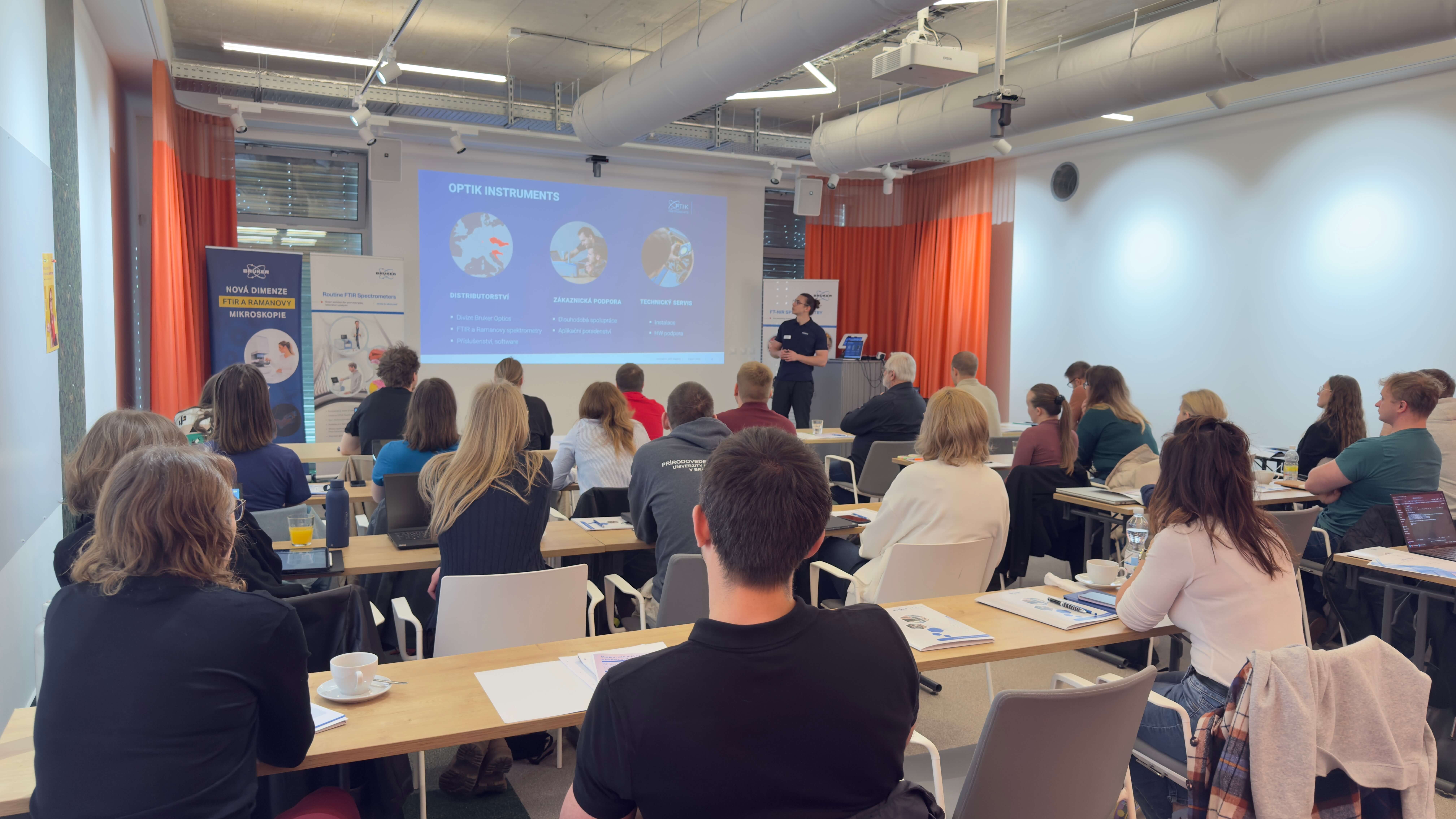 9. dubna navázalo Školení dovedností ve spektroskopickém softwaru OPUS. Účastníci se věnovali personalizaci softwaru a manipulaci se spektry, funkci Quick Compare pro porovnávání a kontrolu kvality, tvorbě vlastních knihoven a vyhledávání, kvantifikaci pomocí Quant 1 (Lambert-Beerův zákon), práci s mikroskopickými daty v OPUS 3D a ukázce tvorby PLS kalibrací v QUANT 2. Každý účastník měl k dispozici vlastní počítač s nainstalovaným softwarem a mohl si vše prakticky vyzkoušet.